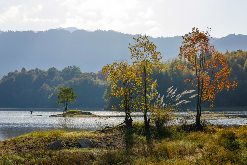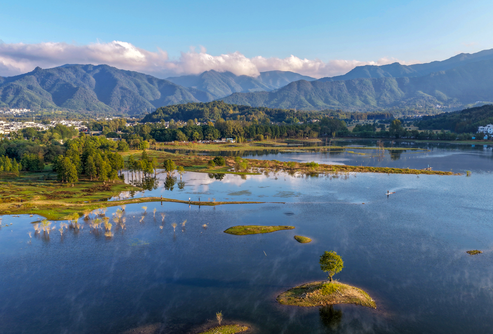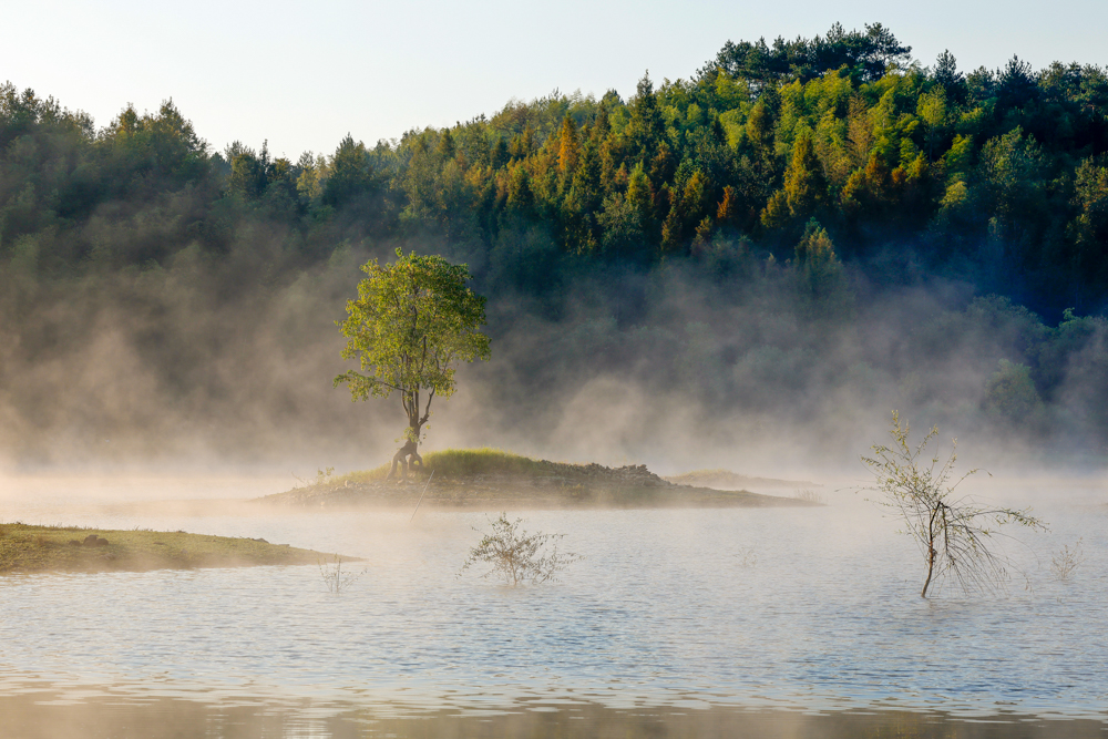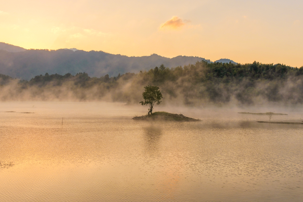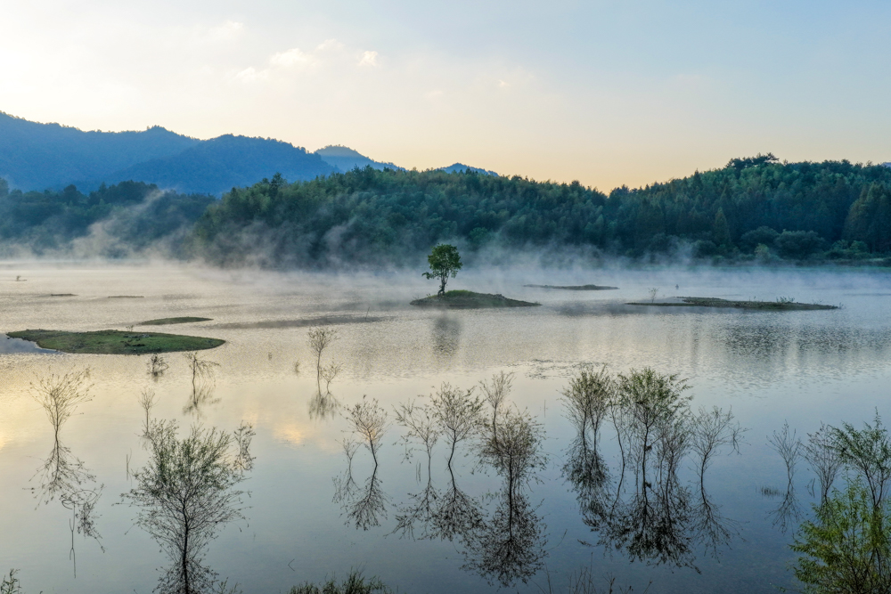 2025年10月23日,安徽省黄山市黟县奇墅湖晨雾蒸腾,金色的霞光洒满整个湖面,熠熠生辉,宛如仙境。