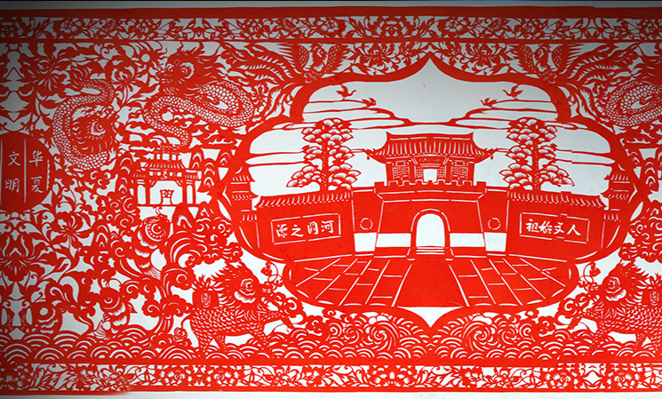 于是我決定回家專門剪紙,但是我父母認為鉸花都是老婆婆們閑著沒事做的事,你一個男孩子還是應該好好賺錢。就這樣我跟父母僵持了很久,但最后還是我拗著性子從外邊回到了我們農村老家,開始尋找會剪紙的老人,去記錄、去詢問、學習我們地區(qū)傳統(tǒng)的剪紙民俗知識。因為現(xiàn)在像剪紙這個藝術,在我們的地區(qū)還僅是一些老人出自一些喜好去剪、去做,但隨著這些老人的去世,這些作品也就會隨著一把火被燒掉。我希望我能把這些東西都保留下來,我希望有更多的人去了解我們地區(qū)的剪紙文化,所以我就下決心收集這些剪紙的資料,去申報非物質文化遺產名錄。想要申報還要去做很多的事情,一是去尋找這些傳世的老作品,另外就是要擴大孟津剪紙的影響力,參加各種比賽去獲獎。那時我白天去尋找老藝人,晚上就自己在屋里埋頭創(chuàng)作,每天晚上都會剪到凌晨一點多。我媽本來是反對的,但是當她看到每晚我都會剪到很晚,她就明白了我是真心喜歡這個事兒,就慢慢地開始心疼我。后來她也幫助我開始粘貼,像我剪的《都說我孟津好風光》,這個作品長13米,沒有那么長的紙,我們就一起粘貼?;巳齻€多月剪完,家里邊沒有那么大粘貼裝裱的空間,我父母就站在我們家院子的平房頂上一起把它鋪開,一個一個地粘起來裱好。
