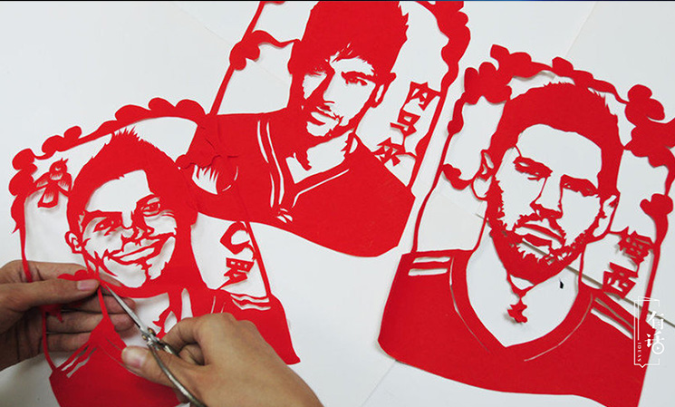 我之前剪過的民俗剪紙作品,像《白蛇傳》、《七月七鵲橋會》、《夜哭郎》等等,這些題材承載的是我們的傳統(tǒng)。但這些較為傳統(tǒng)的剪紙受眾并不多,所以我認為青年人要有新的創(chuàng)新,加入現(xiàn)代社會中許多時尚前衛(wèi)的元素,這樣才能獲得更多人的喜愛。在2014年世界杯的時候,我就試著剪“世界杯剪紙”,梅西、C羅、內馬爾,讓一些球星躍然紙上,讓熱愛足球的年輕人去關注、了解到傳統(tǒng)的剪紙藝術。2015年是世界反法西斯戰(zhàn)爭勝利70周年,我看到關于戰(zhàn)爭的一些資料圖片后,就創(chuàng)作了一幅《南京大屠殺》剪紙。畫面中運用了黃色、紅色、黑色表現(xiàn)土地、火焰還有憤怒,這些都是用剪紙來表達我心中的感受。我的工作室現(xiàn)在也會做一些時尚的婚紗照剪紙,還有生日剪紙等,把這些傳統(tǒng)吉祥的寓意融入到現(xiàn)代人們的需求、裝飾和禮物中。