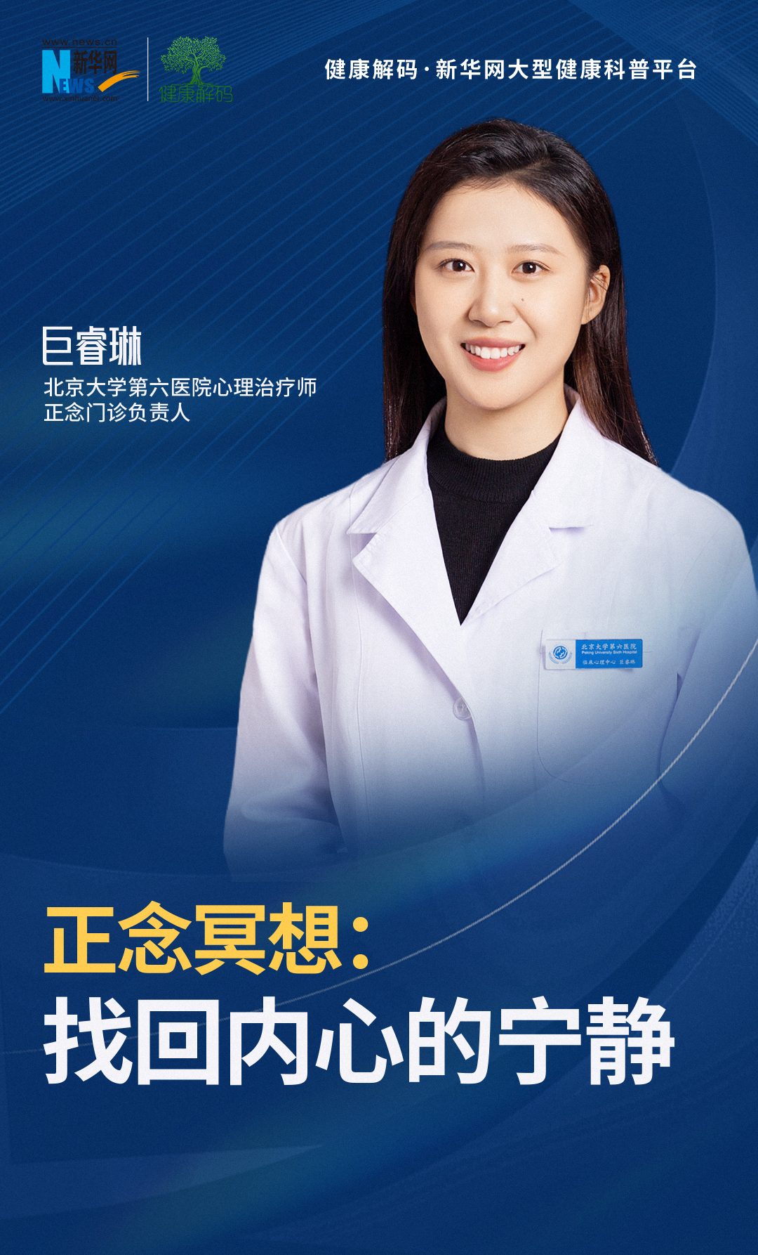 本集《健康解码·心理健康系列》邀请了北京大学第六医院心理治疗师、正念门诊负责人巨睿琳分享《正念冥想:找回内心的宁静》。