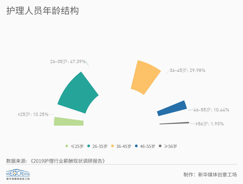 護(hù)士這一群體中,年輕力量居多。根據(jù)《護(hù)理管理雜志》統(tǒng)計(jì)數(shù)據(jù)顯示,26-35歲的護(hù)理人員占比幅度最大為47.39%,接近護(hù)理群體的近五成,36-45歲年齡段的護(hù)理人員次之,26-45歲年齡段的護(hù)理群體是整個(gè)護(hù)理行業(yè)的中流砥柱。