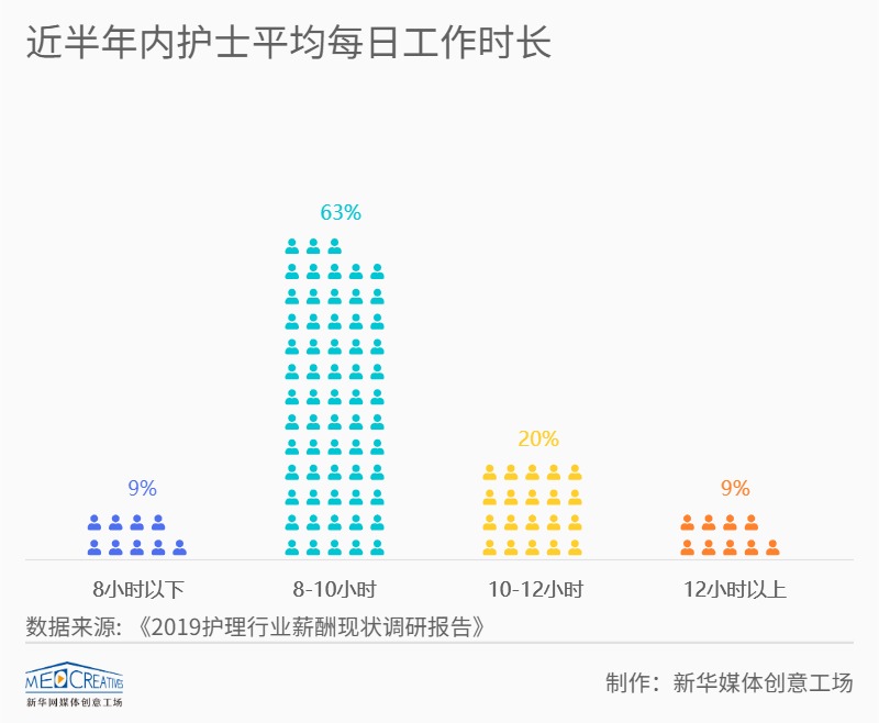 2019年8月,醫(yī)學(xué)界傳媒發(fā)布《2019護(hù)理行業(yè)薪酬現(xiàn)狀調(diào)研報(bào)告》,報(bào)告顯示91%的護(hù)士每日工作8小時(shí)以上,近三成護(hù)士每日工作超過10小時(shí),其中超過12小時(shí)占比9%,大部分護(hù)士每日工作時(shí)間在8—10小時(shí)。