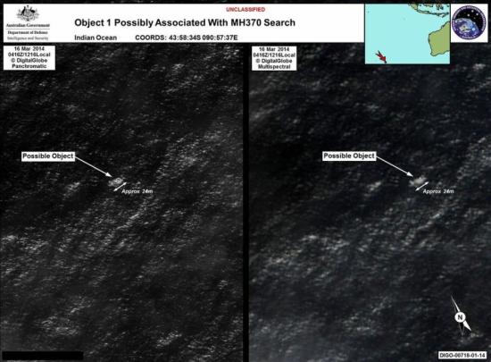 澳大利亞海事安全局20日在“推特”上公布了發(fā)現(xiàn)疑似與馬航失聯(lián)客機有關(guān)的物體的衛(wèi)星圖像。在圖像中,澳方標(biāo)明,其中一件物體長約24米,另一件長約5米。衛(wèi)星是在3月16日抓取的這一圖像。圖片來源:澳大利亞海事安全局