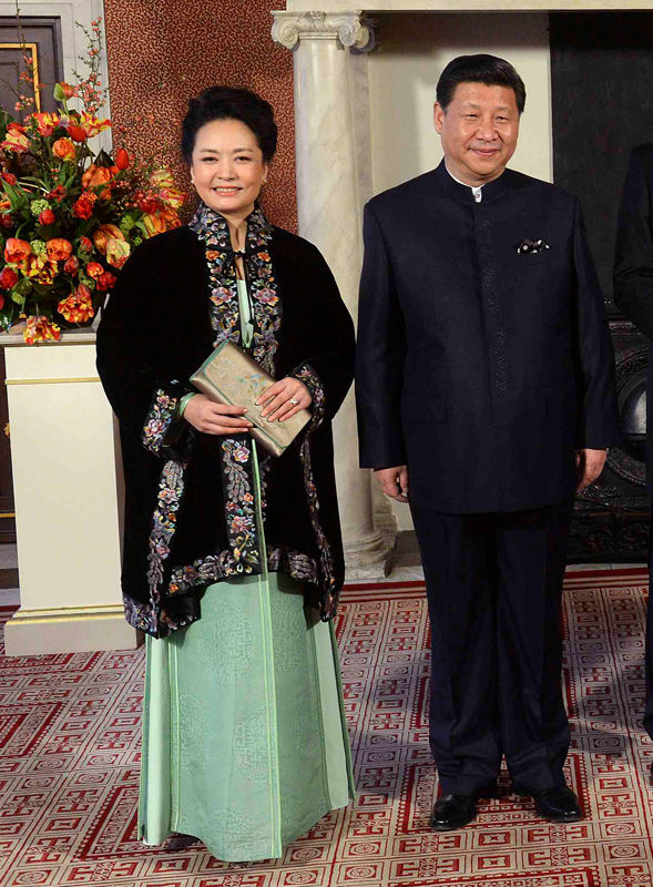 ——在出席威廉-亞歷山大國(guó)王舉行的國(guó)宴時(shí),習(xí)主席與夫人彭麗媛都以中式服裝亮相。習(xí)主席穿著的中式服裝色彩飽和,略帶暗光澤,頗具莊嚴(yán)感;高密度高支紗的面料讓人感覺(jué)嚴(yán)謹(jǐn)與厚重;在設(shè)計(jì)上,暗門襟的設(shè)計(jì)將前胸的紐扣都隱藏起來(lái),沉穩(wěn)大氣,淡去人們對(duì)于中山裝的記憶。頗具巧思的是左前胸呼應(yīng)西裝口袋巾的圖案設(shè)計(jì),體現(xiàn)出對(duì)西方禮儀的尊重,也營(yíng)造出輕松和諧的氛圍。彭麗媛穿著的是牡丹花刺繡的外套,內(nèi)搭粉果綠的長(zhǎng)裙,長(zhǎng)裙很具有清新感,內(nèi)藏著對(duì)綠色環(huán)保的崇尚。中國(guó)刺繡素來(lái)被西方人所崇尚,牡丹花自古被視為中國(guó)的國(guó)花,頗具傳統(tǒng)風(fēng)格的粉果綠色彩,給人以清新感,同時(shí)內(nèi)藏對(duì)綠色環(huán)保的崇尚。整套服裝具有很鮮明的中國(guó)特色,非常符合中國(guó)人的審美觀,又符合西方時(shí)尚,并且廓形感很強(qiáng)。