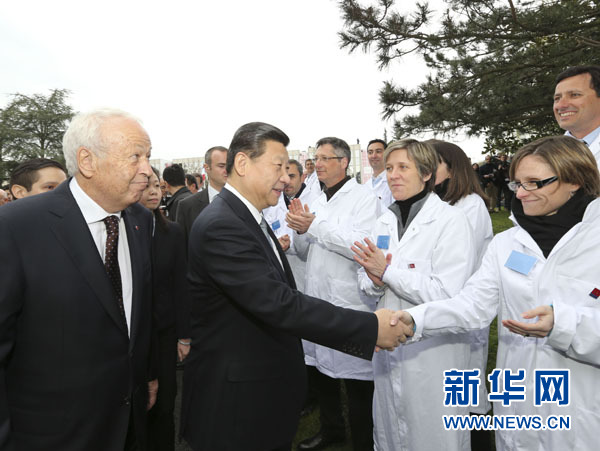習(xí)近平和夫人彭麗媛抵達時,梅里埃集團總裁阿蘭·梅里埃率家族成員以及該中心員工列隊熱烈歡迎。法國政府外長法比尤斯、高教部長菲奧拉索陪同參觀。