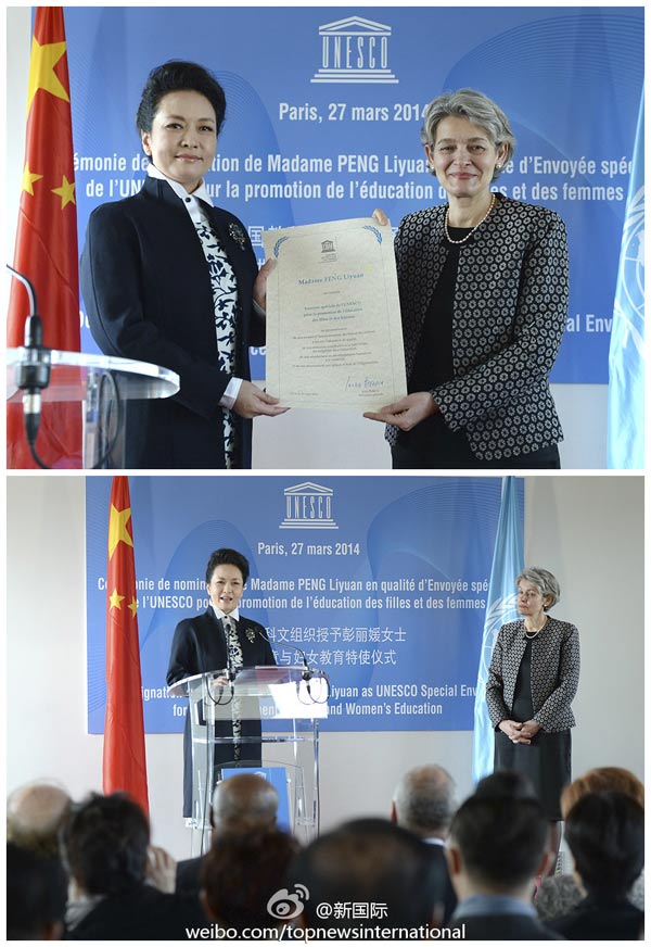 ????新華網(wǎng)北京3月27日電 據(jù)新華社“新國際”微博報(bào)道,習(xí)近平主席夫人彭麗媛27日在巴黎聯(lián)合國教科文組織總部被授予“促進(jìn)女童和婦女教育特使”榮譽(yù)稱號。從博科娃總干事手中接過證書后,彭麗媛說,這是一項(xiàng)崇高的事業(yè),我愿意盡我所能,幫助更多孩子,為更多姐妹爭取接受教育的權(quán)利。