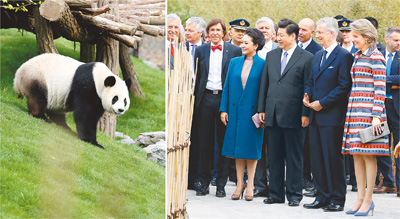 習(xí)近平和夫人彭麗媛抵達時,受到菲利普國王和瑪?shù)贍柕峦鹾?、比利時首相迪呂波熱情迎接。兩國領(lǐng)導(dǎo)人一同步入中國園。亭臺樓閣、雕梁畫棟、鳥語花香,這里宛如一幅恬靜祥和的中華寫意畫。兩國元首夫婦沿著回廊曲徑,穿過青翠竹林,前往大熊貓園。他們邊走邊談,回顧中比兩國友好交往。