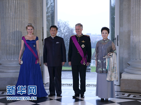 ????3月31日晚,比利時國王菲利普在布魯塞爾拉肯宮舉行隆重國宴歡迎國家主席習近平到訪。習近平和夫人彭麗媛抵達時,受到菲利普國王和瑪?shù)贍柕峦鹾鬅崆橛?。新華社記者 龐興雷 攝