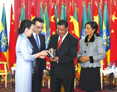 ▲李克強總理與夫人程虹當(dāng)?shù)貢r間6日上午同埃塞總統(tǒng)穆拉圖夫婦在國家宮會見。會見后,程虹將自己的著作和譯著贈送給姆拉圖總統(tǒng)夫婦。圖/中國政府網(wǎng)