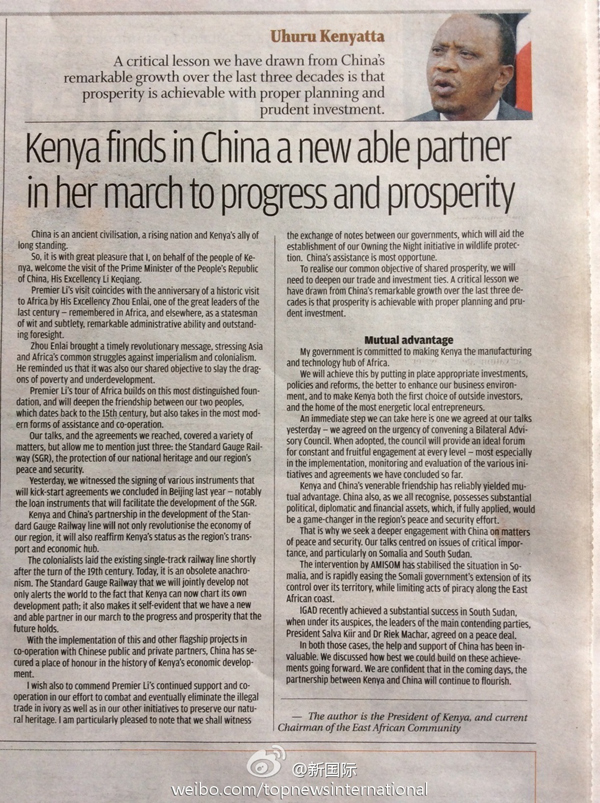 ????新華網(wǎng)北京5月11日電? 據(jù)新華社“新國際”微博報道,肯尼亞《旗幟報》11日發(fā)表肯雅塔總統(tǒng)署名文章《肯將中國視為發(fā)展繁榮進(jìn)程中的強(qiáng)力伙伴》。文章稱,李克強(qiáng)此訪將進(jìn)一步加深傳統(tǒng)友誼,推動雙方新時期合作。隨著多領(lǐng)域的良好合作,中國在肯經(jīng)濟(jì)社會發(fā)展中重要性與日俱增。肯方對肯中關(guān)系未來充滿信心。