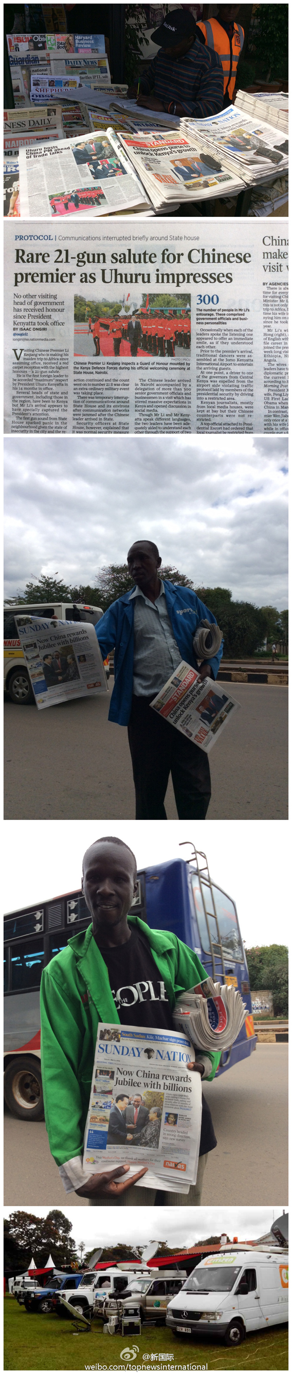 ????新華網(wǎng)北京5月11日電? 據(jù)新華社“新國際”微博報道,連日來,肯尼亞各大媒體紛紛對李克強總理訪肯進行全方位報道。主要報紙均在頭版頭條大篇幅介紹訪問情況,并開辟專版引述李總理講話對肯中關(guān)系進行述評??先箅娨暸_現(xiàn)場直播李總理和肯雅塔總統(tǒng)會見記者實況。肯媒體還高度評價中國在文化教育等領(lǐng)域的軟實力外交。