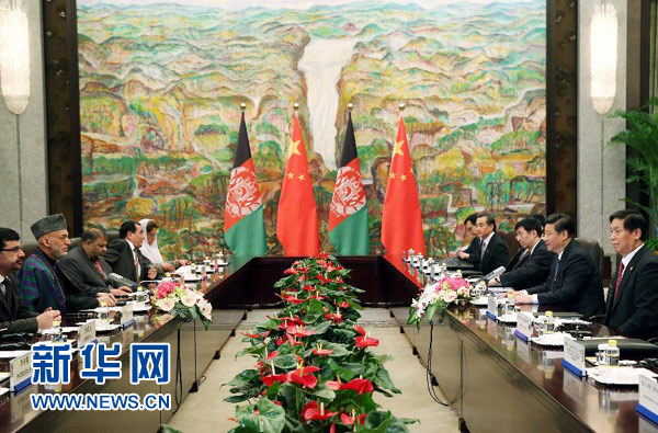????卡爾扎伊表示,阿中兩國有著兄弟般深厚的友誼,中國是阿富汗信賴的好鄰居。阿方感謝中方給予阿富汗和平重建的寶貴支持。無論阿富汗大選結(jié)果如何,阿方?jīng)Q心同中方發(fā)展親密的睦鄰友好關(guān)系,希望中方繼續(xù)幫助阿富汗實現(xiàn)穩(wěn)定、和解、發(fā)展,幫助阿富汗培訓(xùn)各類人才。恐怖主義、跨國犯罪是阿中兩國共同的敵人,阿方愿同中方合力打擊。