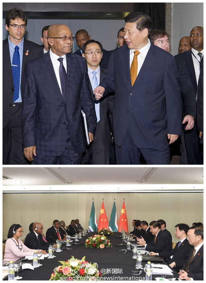 ???? 新華網(wǎng)北京7月15日電 據(jù)新華社“新國際”微博報道,習(xí)近平主席14日在巴西會見南非總統(tǒng)祖馬。習(xí)近平指出,和平與發(fā)展是非洲的主題。中非是命運(yùn)共同體,我們愿意同非洲國家分享發(fā)展經(jīng)驗,積極參與非洲和平安全事務(wù),推進(jìn)非洲跨國跨區(qū)域互聯(lián)互通項目,為促進(jìn)非洲一體化作出更大貢獻(xiàn)。?