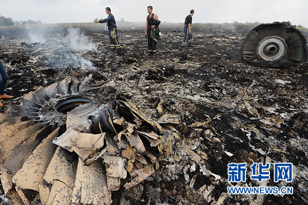 ????在烏克蘭境內(nèi)墜毀的馬航MH17客機殘骸。這是7月17日在靠近俄羅斯邊界的烏克蘭東部地區(qū)拍攝的客機墜毀現(xiàn)場。新華社發(fā)