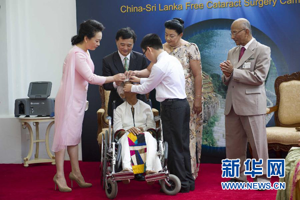 ????在兩國元首夫人共同見證下,許鵬飛為一位接受復(fù)明手術(shù)的斯里蘭卡白內(nèi)障患者揭開紗布。彭麗媛和施蘭蒂向在場(chǎng)的斯里蘭卡復(fù)明患者致以問候和祝福。彭麗媛向斯方贈(zèng)送白內(nèi)障手術(shù)儀器,鼓勵(lì)“中斯友好光明行”活動(dòng)繼續(xù)譜寫中斯友好交往的佳話。