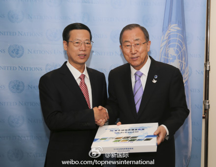 ????新華網(wǎng)北京9月23日電 據(jù)新華社“新國際”微博報道,國家主席習(xí)近平特使、國務(wù)院副總理張高麗22日在聯(lián)合國總部與聯(lián)合國秘書長潘基文共同出席中國政府向聯(lián)合國捐贈30米分辨率全球地表覆蓋數(shù)據(jù)儀式。張高麗表示,中國政府正式將世界上首套30米分辨率全球地表覆蓋數(shù)據(jù)捐贈給聯(lián)合國,這是為即將舉行的氣候峰會帶來的一份禮物。