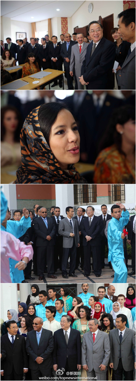 ??? 新華網(wǎng)北京11月6日電 據(jù)新華社“新國際”微博報道,全國政協(xié)主席俞正聲5日參觀摩洛哥穆罕默德五世大學孔子學院,身著摩中兩國民族服裝的當?shù)貙W生誦唐詩、打太極、跳《小蘋果》歡迎。俞正聲走進課堂對學生說:“你們是中摩友好的未來。希望大家用心學好中文,促進合作交流?!?(記者李拯宇 攝影劉衛(wèi)兵)
