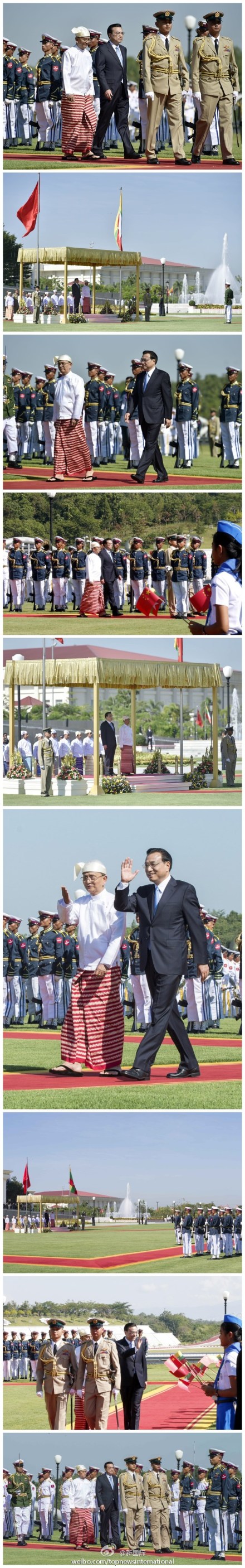 ??? 新華網北京11月14日電 據新華社“新國際”微博報道,緬甸總統(tǒng)吳登盛14日在內比都總統(tǒng)府前廣場舉行隆重儀式,歡迎中國國務院總理李克強對緬甸進行正式訪問。這是李克強就任總理以來首次訪問緬甸。