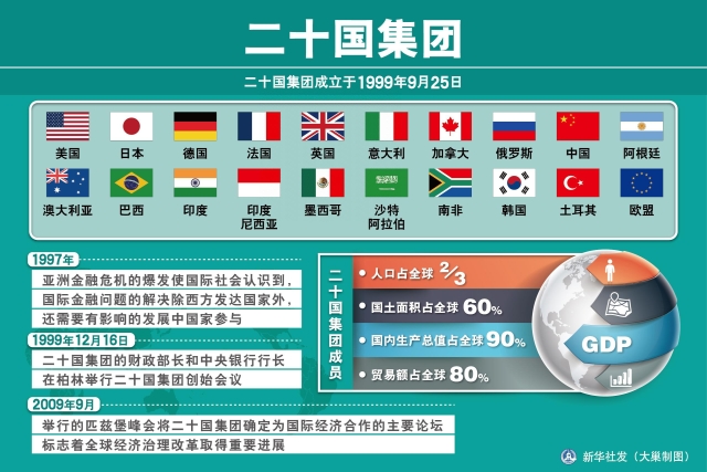 可以說,中國成功地引領(lǐng)了亞太區(qū)域合作方向與政策制定,極大地增強(qiáng)了中國在亞太治理中的發(fā)言權(quán)。如果說,APEC是一個(gè)成員限于亞太地區(qū)的區(qū)域性治理平臺(tái),那二十國集團(tuán)(G20)就是一個(gè)覆蓋面更廣的、全球性的治理平臺(tái)。G20由西方七國集團(tuán)、俄羅斯和中國等主要新興經(jīng)濟(jì)體組成,經(jīng)濟(jì)規(guī)模約占全球90%,貿(mào)易總額占全球總量的80%。