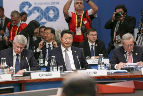 ????(圖為2014年11月15日,二十國集團(tuán)領(lǐng)導(dǎo)人第九次峰會在澳大利亞布里斯班舉行。國家主席習(xí)近平出席會議并發(fā)表題為《推動創(chuàng)新發(fā)展 實現(xiàn)聯(lián)動增長》的重要講話。新華社發(fā))