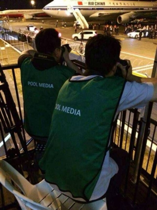 ??? 習(xí)近平主席的專機(jī),降落在布里斯班,已經(jīng)是當(dāng)?shù)貢r間14日晚上9點50左右,話說布里斯班白天驕陽灼人,太陽一落山氣溫蹭蹭下降,等候?qū)C(jī)抵達(dá)的記者要是沒加件外套,就只能挨凍啦!