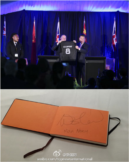 ??? 新華網(wǎng)北京11月20日電? 據(jù)新華社“新國(guó)際”微博報(bào)道,中新兩國(guó)領(lǐng)導(dǎo)人20日共見記者后,新西蘭英式橄欖球球星Ma'a Nonu贈(zèng)送習(xí)主席一件球衣。習(xí)主席高興地說,歡迎你到中國(guó)交流、教學(xué)、比賽,推動(dòng)英式橄欖球在中國(guó)的發(fā)展。Nonu興奮地說:“我現(xiàn)在就可以去!”