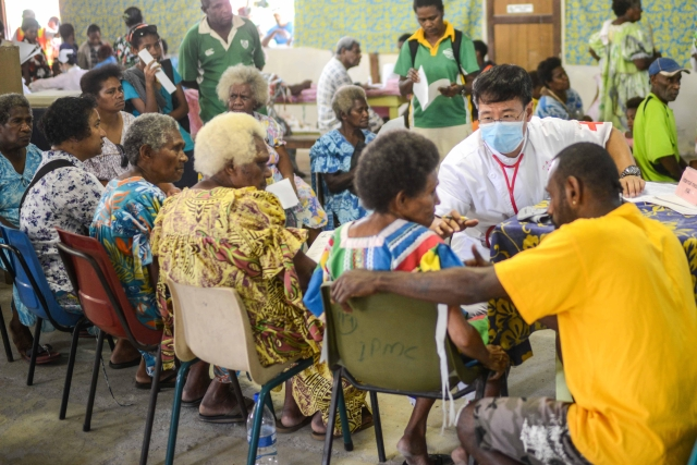????(圖為2014年9月5日,中國海軍和平方舟醫(yī)院船的前出醫(yī)療分隊前往位于瓦努阿圖首都維拉港郊區(qū)的美麗村,為因路途較遠(yuǎn)而不方便前往和平方舟醫(yī)院船就診的當(dāng)?shù)鼐用襁M(jìn)行醫(yī)療服務(wù)。新華社記者覃海石攝)