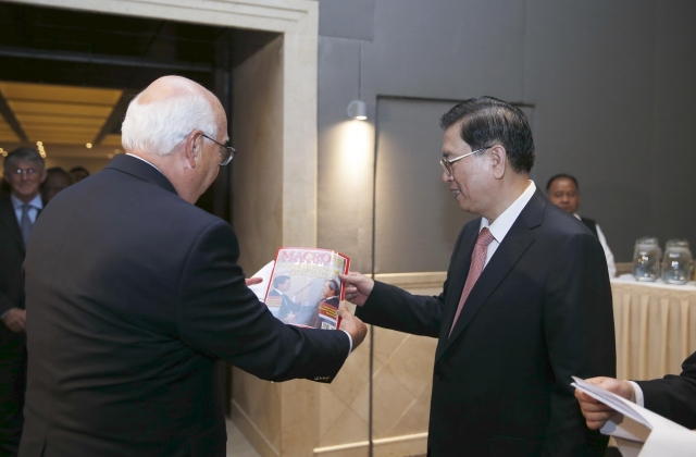 ??? 希門內(nèi)斯將最新一期《宏觀經(jīng)濟(jì)》送給張德江委員長。1972年希門內(nèi)斯首次訪華,是時(shí)任墨西哥總統(tǒng)埃切維里亞的新聞官。他后來多次到中國參觀考察,親眼目睹了中國的巨大變化。他說原來的北京是個(gè)“矮城”,樓不高,車輛少,步行的人多?,F(xiàn)在的北京“已成為高樓林立的現(xiàn)代化大都市”。