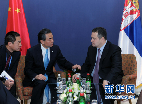 ??? 12月17日,正在陪同李克強(qiáng)總理訪問塞爾維亞的外交部長王毅應(yīng)約會(huì)見塞爾維亞第一副總理兼外長達(dá)契奇。 新華社記者 饒愛民 攝