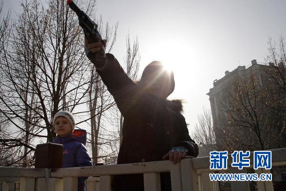 ????資料圖片:2月15日,在烏克蘭東部城市頓涅茨克,一名男孩手持玩具槍在街頭玩耍。烏克蘭武裝力量總參謀部發(fā)言人謝列茲尼奧夫15日說,自當?shù)貢r間凌晨3時起,烏東部沖突地區(qū)的槍炮射擊均已停止,?;饏f(xié)議得到遵守。 新華社發(fā)(葉爾莫琴科攝)