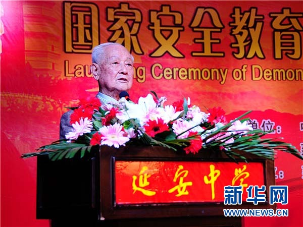 ????5月12日,中國政策科學(xué)研究會國家安全政策委員會副會長、軍事科學(xué)院原副院長糜振玉,在延安中學(xué)“國家安全教育示范基地”啟動儀式上致辭。(新華網(wǎng)記者 郝斐然 攝)