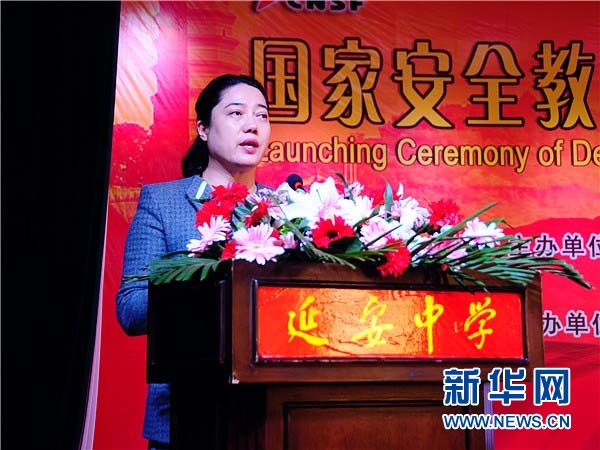 ????延安中學(xué)校長蘭愛平在延安中學(xué)“國家安全教育示范基地”啟動儀式上發(fā)言。(新華網(wǎng)記者 郝斐然 攝)