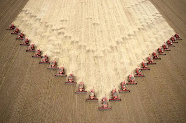 ↑2009年3月5日,在巴西西部的馬托格羅索州,工人們駕駛收割機(jī)在田間收割大豆。(新華社/路透)