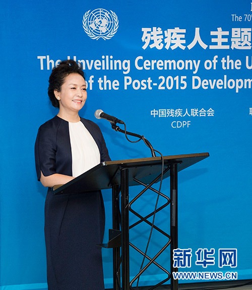 9月27日,國(guó)家主席習(xí)近平夫人彭麗媛在紐約出席殘疾人主題郵票紀(jì)念版張首發(fā)式。 新華社記者王曄攝