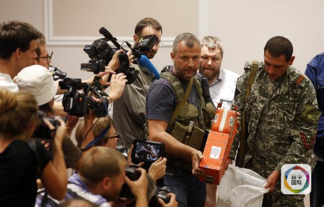 2014年7月22日凌晨,在烏克蘭頓涅茨克州,烏克蘭東部民間武裝代表正在向媒體展示黑匣子。烏克蘭東部民間武裝領(lǐng)導(dǎo)人、“頓涅茨克人民共和國(guó)”總理博羅代22日凌晨將馬航MH17航班客機(jī)黑匣子交給馬來西亞方面。新華社/路透