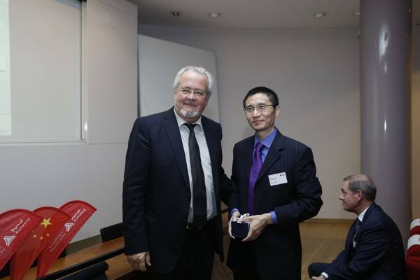 ↑安特衛(wèi)普港務局主席Marc van Peel向出席活動的中國駐比利時大使館商務參贊郭建軍合影。