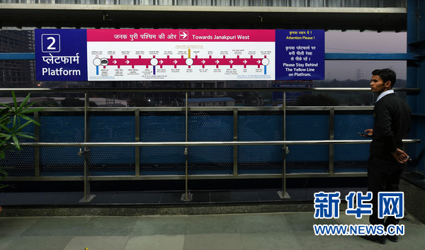 12月25日,在印度首都新德里洋紅色地鐵線,一名工作人員在站牌下職守。當(dāng)日,連接新德里及其衛(wèi)星城諾伊達(dá)(Noida)之間的洋紅色地鐵線建成通車(chē)。這條線路全長(zhǎng)12.64公里。德里地鐵公司計(jì)劃未來(lái)提高這條地鐵線路自動(dòng)化水平,以“無(wú)人值守模式”運(yùn)行。目前,新德里運(yùn)營(yíng)地鐵線路共有7條,分別用顏色命名,包括紅色、黃色、藍(lán)色、綠色、橙色、紫羅蘭和洋紅色。新華網(wǎng)發(fā) (張迺杰 攝)