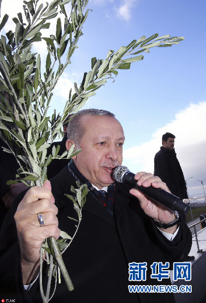 當?shù)貢r間2018年2月17日,土耳其埃斯基謝希爾,土耳其總統(tǒng)埃爾多安出席正義與發(fā)展黨集會,手持橄欖枝發(fā)表講話。(圖片來源:東方IC)