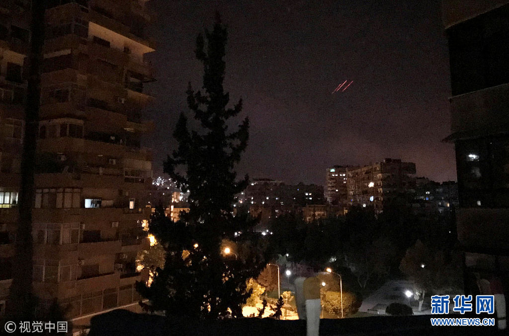 4月14日,敘利亞大馬士革,特朗普決定聯(lián)合英國和法國對(duì)敘利亞進(jìn)行精確打擊,大馬士革傳出爆炸聲,敘利亞方面進(jìn)行反擊。敘利亞阿拉伯?dāng)⒗麃喭ㄓ嵣?SANA)報(bào)道,敘政府軍在大馬士革以南地區(qū)擊落13枚導(dǎo)彈。敘利亞國家電視臺(tái)此前稱美英法三國對(duì)敘利亞“發(fā)動(dòng)了侵略”。(圖片來源:視覺中國)