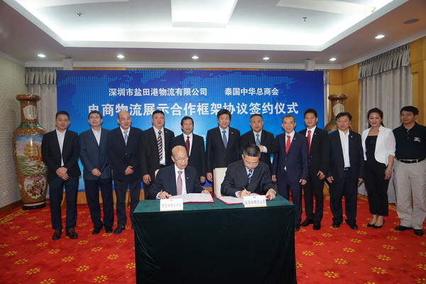 泰國中華總商會主席陳振治一行與深圳市鹽田港物流有限公司簽署電商物流展示合作框架協(xié)議。圖中前排為陳振治(左)和劉南安(右)。主辦方供圖。