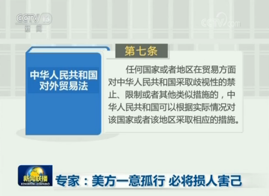 專家表示,中方采取的反制措施合理合法。根據(jù)《中華人民共和國對外貿(mào)易法》第七條,任何國家或者地區(qū)在貿(mào)易方面對中華人民共和國采取歧視性的禁止、限制或者其他類似措施的,中華人民共和國可以根據(jù)實際情況對該國家或者該地區(qū)采取相應(yīng)的措施。