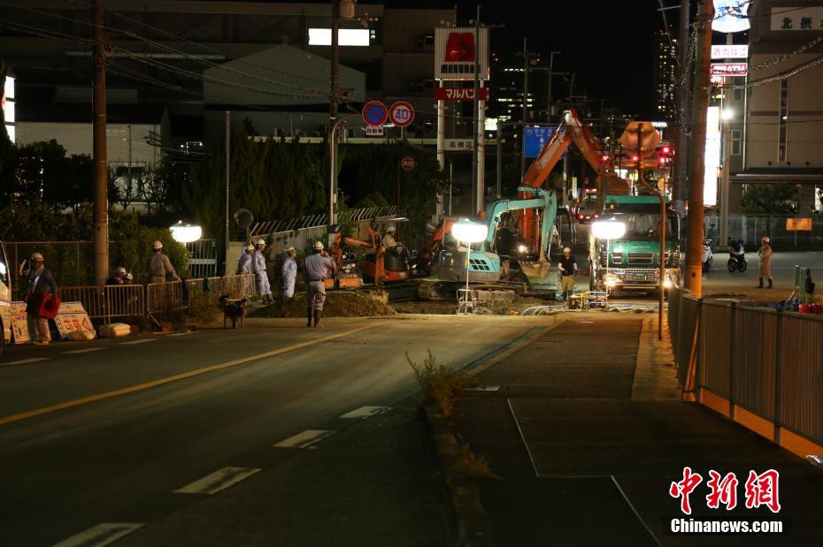 6月18日,日本大阪府發(fā)生6.1級地震。圖為位于震源附近的高槻市一處路面出現(xiàn)凹陷,相關(guān)部門正連夜進(jìn)行搶修。中新社記者 呂少威 攝
