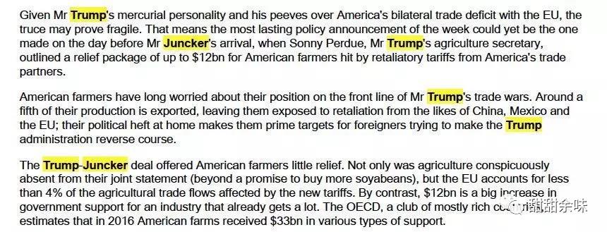 2.從英國媒體的報道切入點來看,英國作為歐洲國家的重要代表(雖然英國已經發(fā)布了脫歐白皮書,但是在歐盟的官網上,歐盟的28個國家里,目前仍然是包括了United Kingdom的),對美國對外咋咋呼呼給各國添亂、實際上不動聲色自有打算的做法并不感冒。管中窺豹,或可判斷容克代表歐盟剛剛表過的態(tài)的不確定性將進一步上升,除了德國、法國之外,英國也不可能真的跟美國好到一個鼻孔出氣。更不要說在歐盟內部農業(yè)出口占大頭的其他國家。
