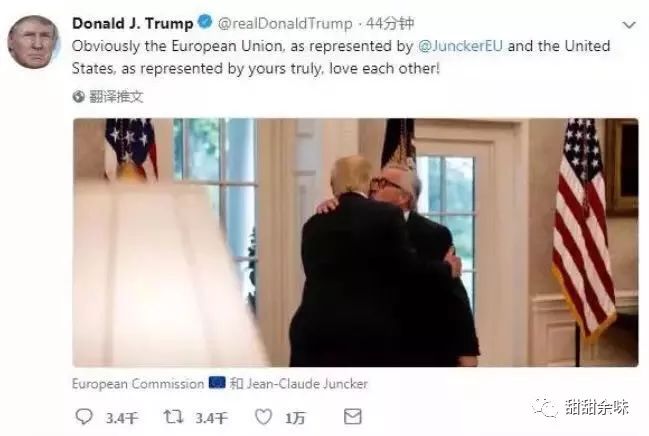 畢竟,到訪美國的歐盟委員會主席容克,不僅得到了美國媒體濃墨重彩的報道,更在特朗普的推特上,將白宮玫瑰園的浪漫延續(xù)了下去——《經濟學人》給這次見面取了個唯美貼切的標題:Sealed with a kiss(以吻封緘)。(哈哈哈,莫名覺得這首歐美經典情歌用在這里居然有說不出的貼切,《經濟學人》取標題的能力也真是要給個大寫的服字?。?/p>
