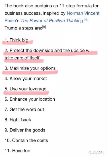 白宮及特朗普近期的表現(xiàn)看似散亂反復,實際上并非無跡可循。有個重要的樣本,就是特朗普本人的作品《交易的藝術》(The Art of the Deal)。他在書中回顧自己各種交易經歷,總結出11條重要步驟。