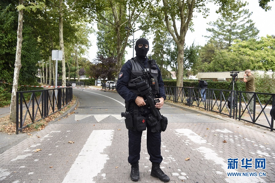 8月23日,在法國巴黎西南郊特拉普市,一名警察在案發(fā)現(xiàn)場警戒。據(jù)法國媒體報道,23日上午,一名男子在首都巴黎西南郊的特拉普市街頭持刀行兇,造成2人死亡、1人受傷;該男子被隨后趕來的法國警方擊斃。 新華社記者陳益宸攝