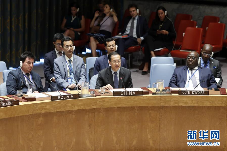 9月6日,在位于紐約的聯(lián)合國(guó)總部,中國(guó)常駐聯(lián)合國(guó)代表馬朝旭(前中)在安理會(huì)敘利亞化武問(wèn)題公開(kāi)會(huì)上發(fā)表講話(huà)。新華社記者李木子 攝
