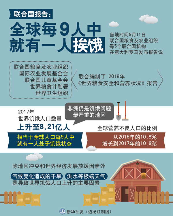 聯(lián)合國(guó)報(bào)告:全球每9人中就有一人挨餓。新華社發(fā) 邊紀(jì)紅 制圖