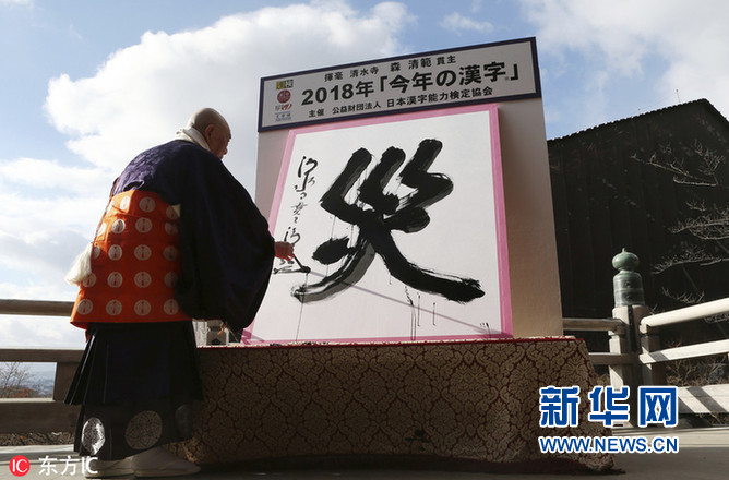 當(dāng)?shù)貢r(shí)間2018年12月12日,日本京都,京都清水寺住持森清范在巨幅和紙上揮毫寫下了今年的年度漢字——“災(zāi)”。(圖片來源:東方IC)