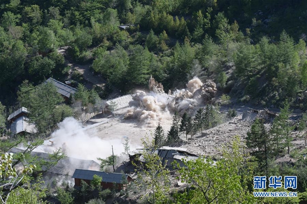 這是5月24日在朝鮮咸鏡北道吉州郡的豐溪里核試驗場拍攝的場內(nèi)地面建筑爆破場景。朝鮮24日在豐溪里核試驗場對多條坑道和附屬設(shè)施進行爆破,并宣布正式廢棄這座核試驗場。 新華社記者 程大雨 攝
